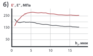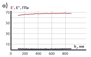 В приборах «НаноСкан-4D» реализован метод динамического измерения контактной жесткости. В основе данного метода лежит измерение квадратурных компонент смещения при приложении гармонической силы, в дополнение к монотонному углублению зонда в образец. На основе полученных данных компонент рассчитываются значения действительной и мнимой компоненты жесткости, а затем на их основе производится расчет значений модулей упругости E’ и E’’, соответствующих синфазной и сдвинутой на 900 компоненте смещения. Типичный диапазон рабочих частот доходит до 50 Гц, однако в случае измерений в преднагруженном состоянии возможна работа на частотах до 300 Гц.