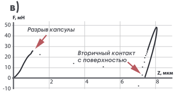 Регистрируемая зависимость нагрузка-смещение позволяет определить силу, при которой происходит разрушение капсулы. По отношению силы к диаметру капсулы определяется характеристика ее механической прочности.