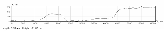 Эксперимент проводился с помощью генератора импульсов высокого напряжения (напряжение импульсов – 60 В, длительность 1 мс) Подача импульсов происходила в случайных местах поверхности. Затем проведено повторное сканирование образца и выявление модифицированных областей. На Рисунке 1 представлен рельеф поверхности пленки железа после проведения ЭЗЛ. Рисунок 2 иллюстрирует профиль поперечного сечения поверхности, явно выражен рельеф окисла, образованного в следствие ЭЗЛ, высота окисной пленки от 25 до 70 нм.